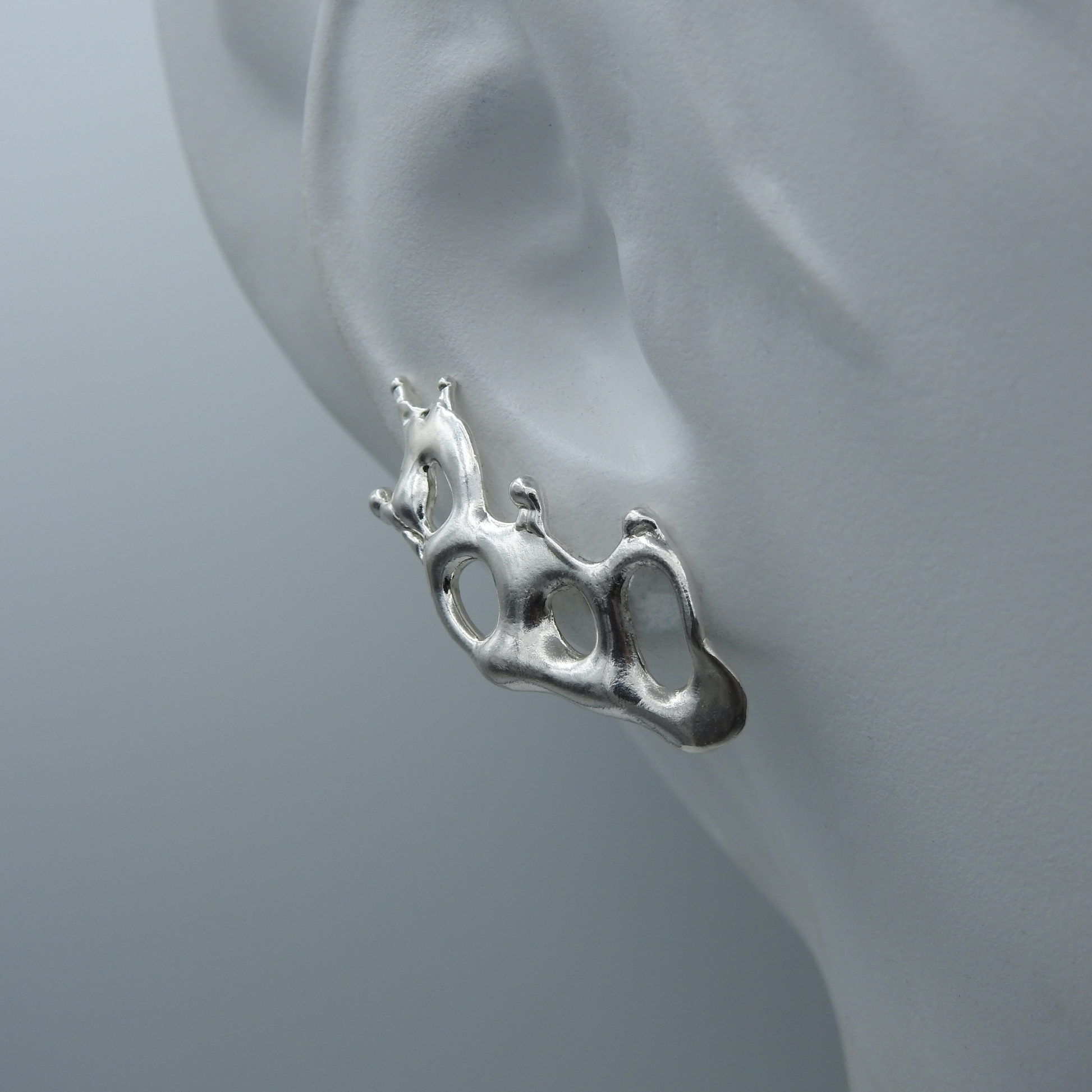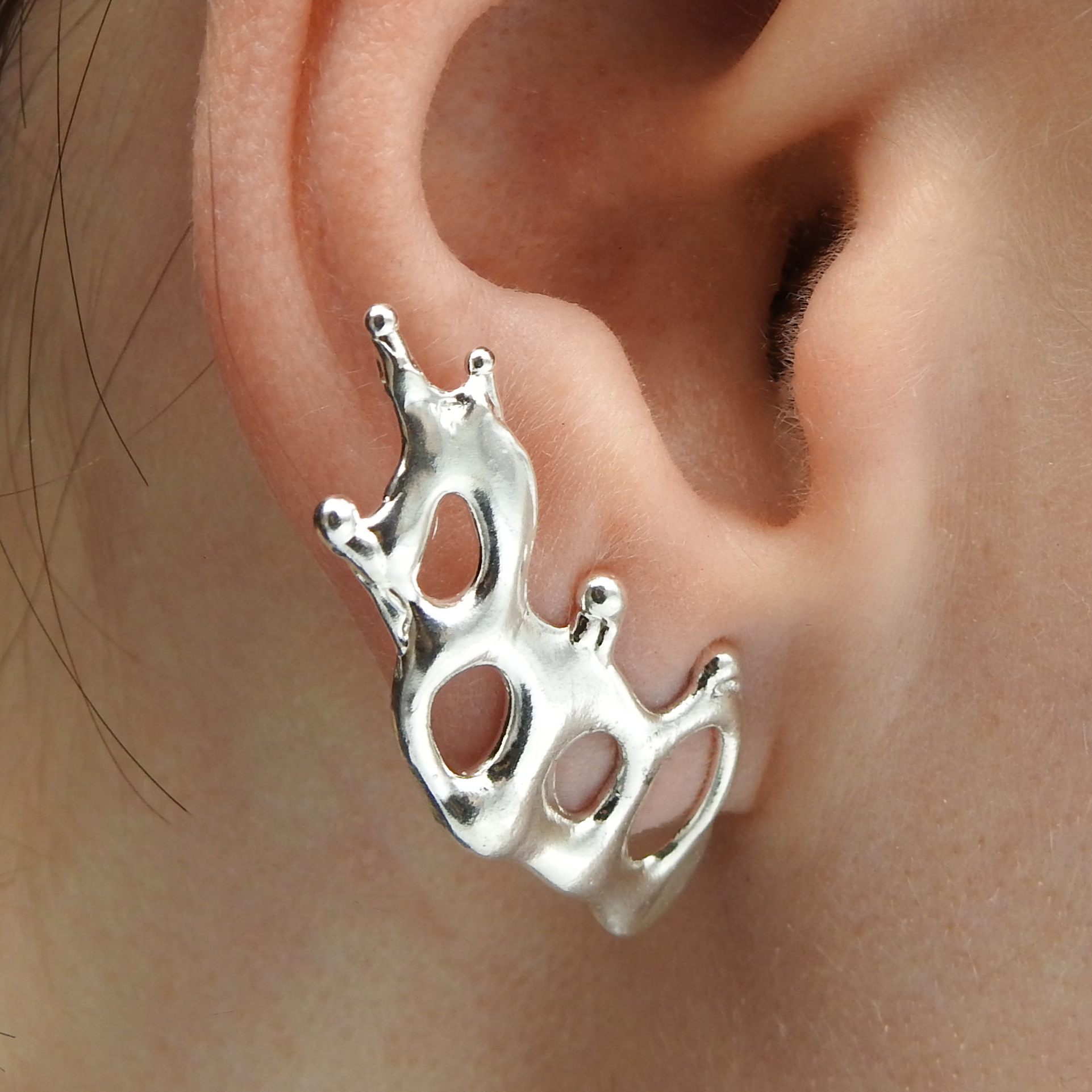 An assymetric set of earrings with small earring clutch for behind the ears included.